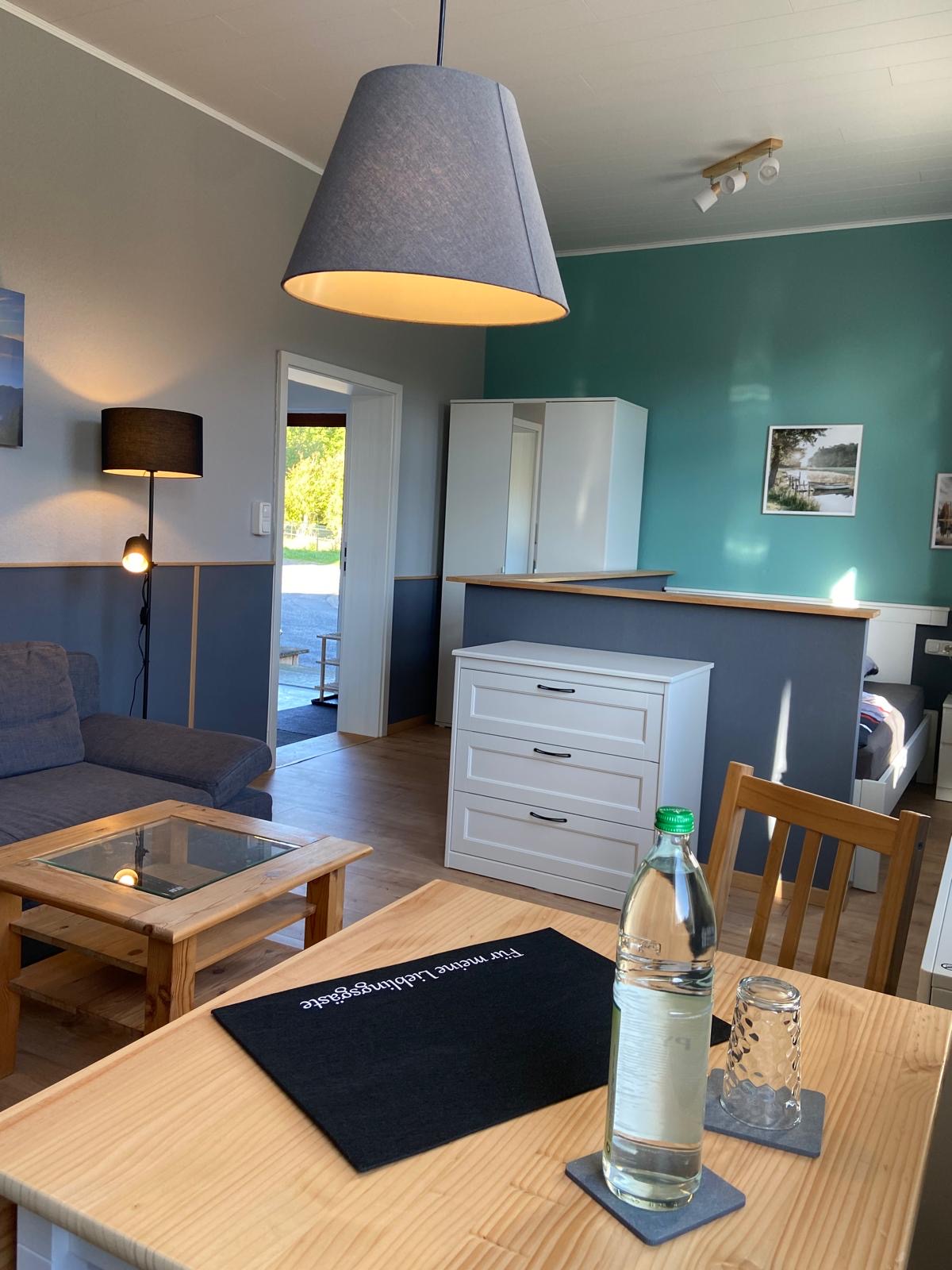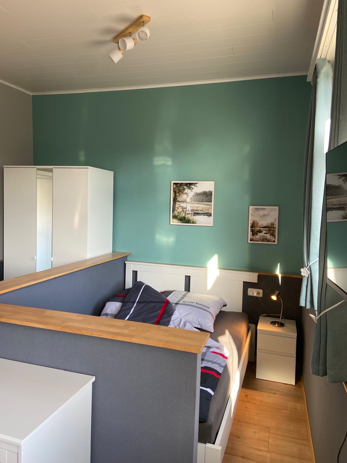 Ihr Wohn/Ess/Schlafraum bietet Platz für eine Person bei längerem Aufenthalt. Für kürzere Aufenthalte ist die Schlafcouch auch für eine zweite Person geeignet. Durch die optische Trennung des Schlafbereiches wirkt der Raum insgesamt wie ein Wohnbereich. Schrank und Kommode bieten gut Stauraum. Die blickdichten Vorhänge verdunkeln gut Elektrische Heizungen in den Räumen erlauben individuelle Einstellung zum Wohlfühlen.