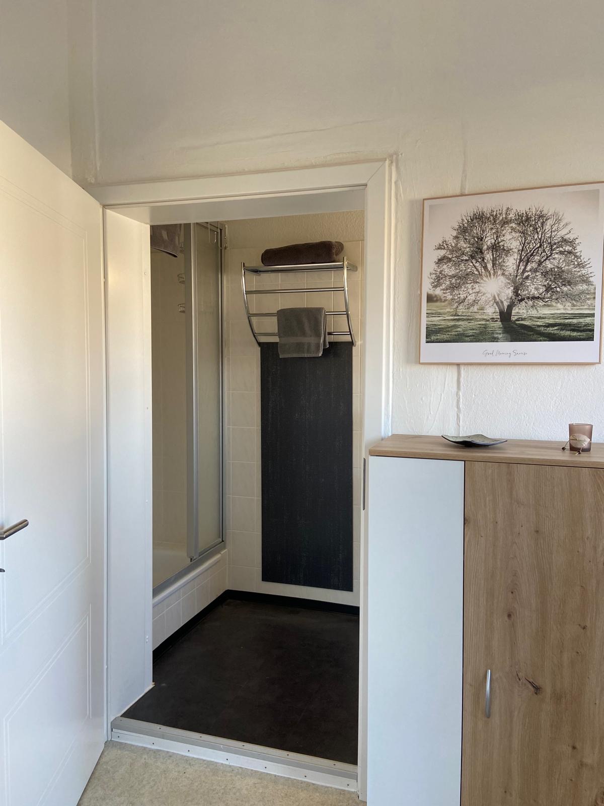 Durch Ihren eigenen Eingang dieses ehemaligen Schulgebäudes des Dorfes betreten Sie die geräumige Diele. Ihr separates, kleines Bad ist mit Dusche, Waschbecken und WC ausgestattet.